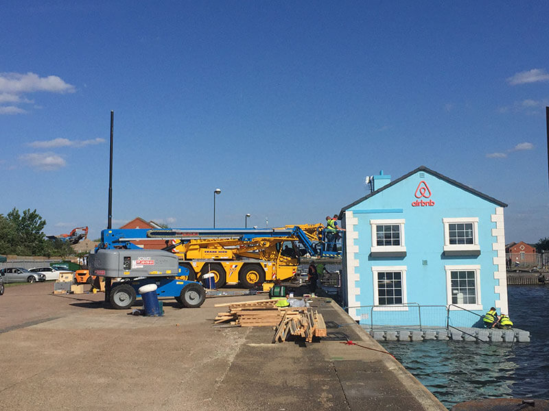 Livett’s teamed up with Star Events on this project and the result was superb! Star masterminded the build of the Floating House; everything to what it was built on (unifloats) to making the domestic plumbing work. Livett’s on the other hand provided the local knowledge and marine plant to get the Floating House from A to B.